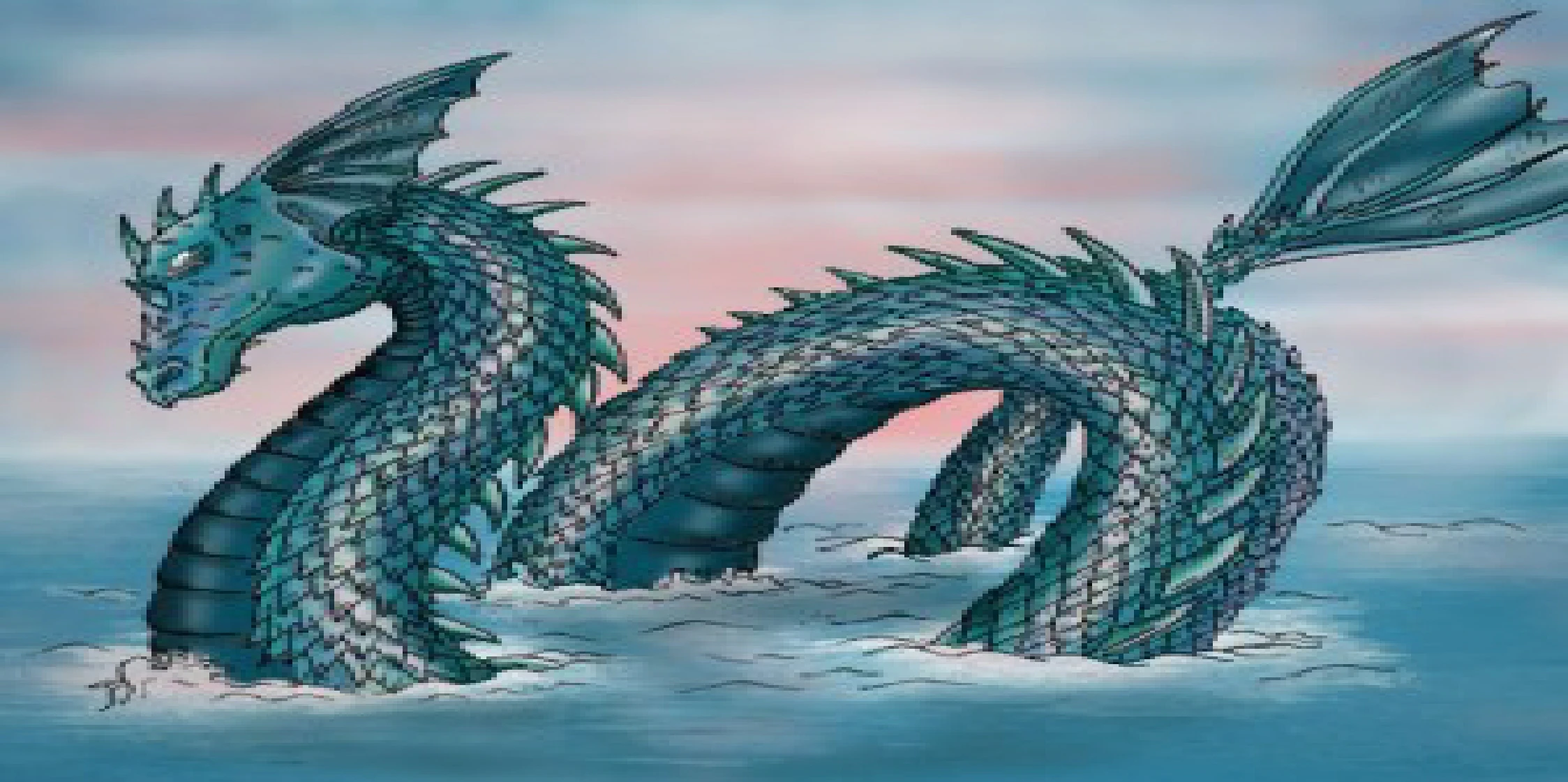 It is 50 feet long and has a head like a python’s. Its neck is 10–15 feet long and 2 feet thick. It has four gray-green or blue body loops, 10 feet apart. It has a frill on the back and a vertical, segmented tail, 2 feet long. It moves with vertical undulations. It was seen close to the coast.