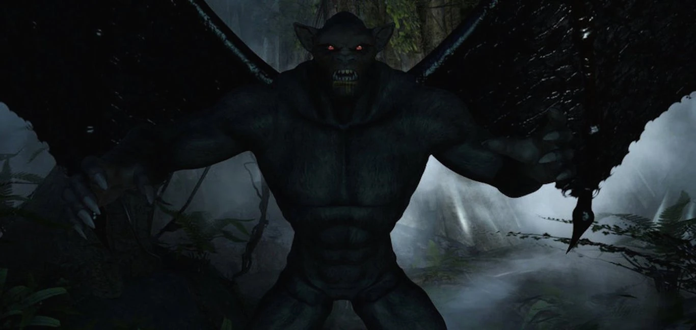 This creature was said to have yellow eyes, a dog-like muzzle, blue fur, sharp teeth, bird-like feet and leathery bat-like wings that span up to fifty feet. In addition, Batsquatch is said to be 9 feet tall and has the ability to affect car engines.