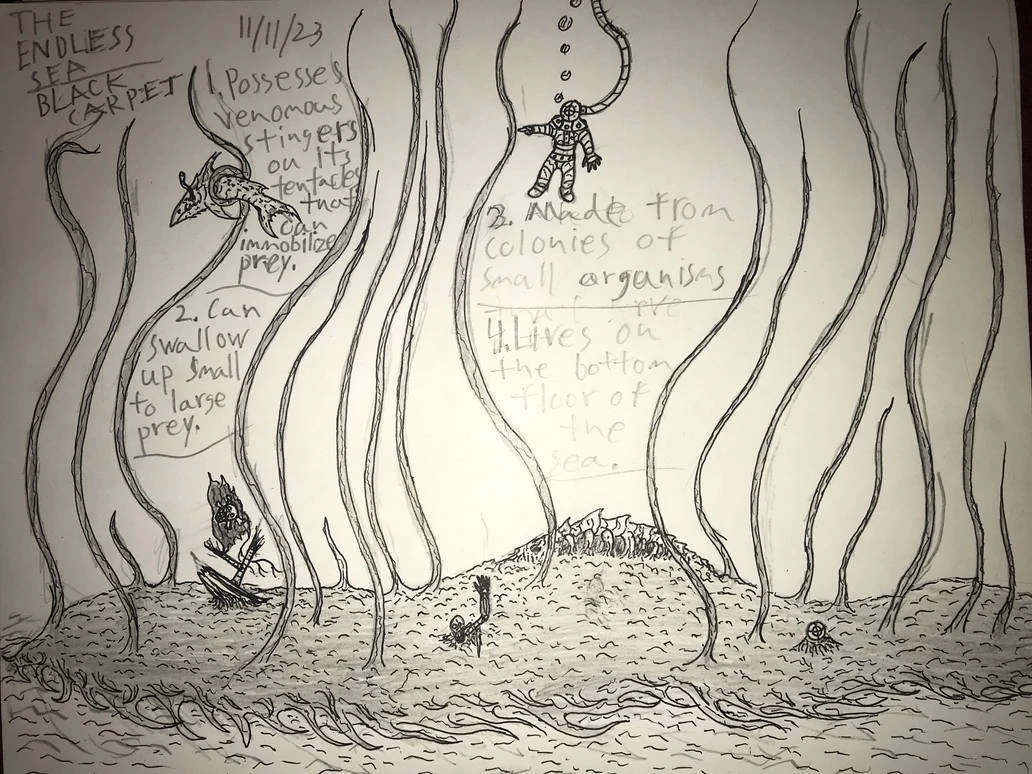 The Black Carpet is an ocean cryptid that resembles a large cluster of organisms. It's first known internet appearance was on a 2020 4chan thread about the Bloop. The Black Carpet is a creature mostly appearing in 4chan greentext stories; outside of the website, it's still a relatively obscure creature.