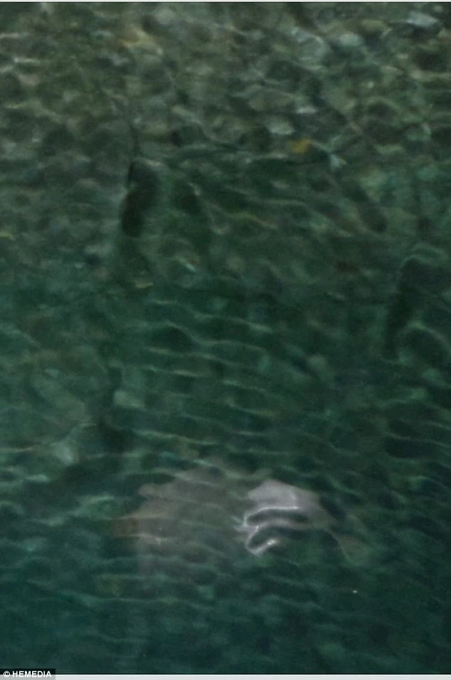 Harvey Robertson was on a boat cruise off the coast of Parga, sailing through sea caves with his family. He was initially just trying to capture the unusual color of the surrounding water with his iPhone camera. Robertson says he didn’t see the animal at the time but when looking back through his camera, Robertson saw that he had captured a grey creature that resembles an elongated manatee. The strange animal appears to pop out of the water in one photo, then disappears under the greenish water in the next.