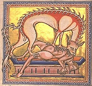 Pliny in his work Natural History (VIII.72 and 107) variously described the crocotta as a combination between a dog and a wolf or between a hyena and a lion. Of the hyena, Pliny writes that it "is popularly believed to be a hermaphrodite and to become male and female in alternate years, the female bearing offspring without any male," and that "among the shepherds’s homesteads it simulates human speech, and picks up the name of one of them so as to call him to come out of doors and tear him to pieces, and also that it imitates a person being sick, to attract the dogs so that it may attack them; that this animal alone digs up corpses; that a female is seldom caught; that its eyes have a thousand variations of color; moreover that when its shadow falls on dogs they are struck dumb; and that it has certain magic arts by which it causes every animal at which it gazes three times to stand rooted to the spot. When crossed with this race of animals the Ethiopian lioness gives birth to the corocotta, that mimics the voices of men and cattle in a similar way. It has a unbroken ridge of bone in each jaw, forming a continuous tooth without any gum." Pliny (VIII.72-73) also writes of another hyena-like creature, the leucrocotta, which he calls "the swiftest of all beasts, about the size of an ass, with a stag's haunches, a lion's neck, tail and breast, badger's head, cloven hoof, mouth opening right back to the ears, and ridges of bone in place of rows of teeth—this animal is reported to imitate the voices of human beings." The Byzantine scholar Photius, epitomizing an ancient work by the Greek author Ctesias (Indica, L), writes: "In Ethiopia there is an animal called crocottas, vulgarly kynolykos [dog-wolf], of amazing strength. It is said to imitate the human voice, to call men by name at night, and to devour those who approach it. It is as brave as a lion, as swift as a horse, and as strong as a bull. It cannot be overcome by any weapon of steel."