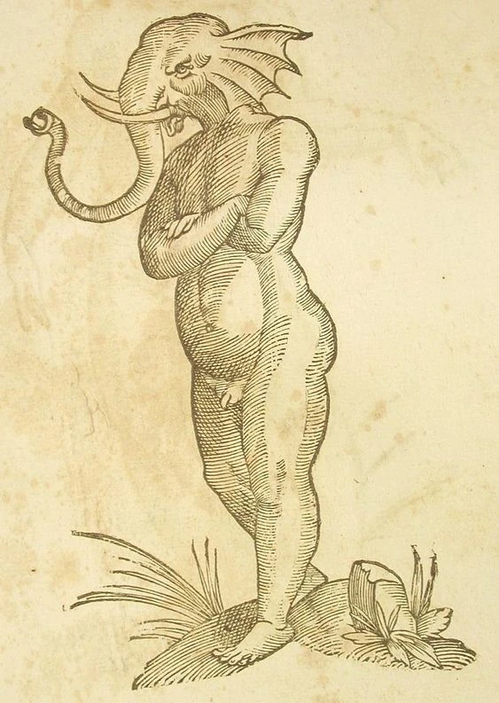 An elephant humanoid from Ulisse Aldrovandi's Monstrorum Historia, 1642.