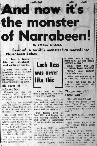 In 1971, there were two fishermen who were fishing on Narrabeen Lake at night. They saw a peculiar brutish gray animal with an unusual locomotion as it went through the water. Later that night, an anonymous woman said she was awoken by a horrible gurgling noise. There was no proof that it was the same pachyderm creature.
