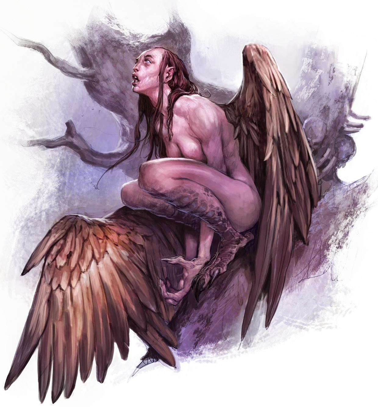 Harpies are typically depicted as having the body of a vulture or eagle, complete with wings, talons, and feathers, while their heads resemble those of women. They are often portrayed with sharp claws and fierce expressions, reflecting their reputation as aggressive and predatory beings. Some depictions also include features such as long, flowing hair or the ability to emit piercing shrieks.