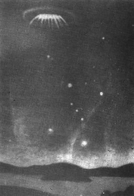 The investigation was conducted by researchers of the Leningrad Arctic and Antarctic Institute, the Geophysical Institute of Obrinsk, and a number of geologists, meteorologists and experts from the Air Force and Navy. Irrespective of what it was, they were at least able to trace the route of the mysterious object almost without a gap. Between 3:06 and 3:10 a.m., police officers in the Finnish capital Helsinki had reported sighting "a bright ball of fire, " which hovered over the airport for 4 minutes, and then moved eastwards. This was also confirmed by the radar at the control tower of the Helsinki airport. A little later the author Limik at Namoyevo, 20 miles northwest of Petrosavodsk, saw it through his telescope. He described the UFO as a lens-shaped object shining violet and surrounded by a shining ring. It had bright pulsating rays of light coming out of it "like the tentacles of a Medusa" (jellyfish). At 3:30 a.m. fishermen on Onezskoe Lake near Primosk saw a bright light in the sky which was surrounded by a kind of haze. At 4:00 a.m. employees at the observatory at Pulkovo saw the ball of fire in the north, as did a pilot in a passenger plane flying from Kiev to Leningrad. After its appearance over Petrosavodsk, they sighted the disc above Yandevar, south of the Karelian capital. At Polovina, 15 miles east of Petrosavodsk, people saw a cloud changing in color at 4:40 a.m. as if it had been lit up by a source of light inside it.