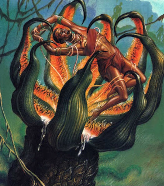 Obediently, she drank, and then, almost instantly, the slender palpi of the tree came alive, quivered, and seized her around her neck and arms. She screamed, but the tendrils gripped her tighter, strangling her, until her cries became a gurgled moan. The contraction of the tendrils caused the fluid of the tree to stream down its trunk, mingling with the "blood and oozing viscera of the victim."