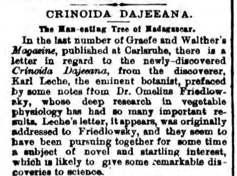 The NY World claimed to have obtained its information about the man-eating tree from "the last number of Graefe and Walther's Magazine, published at Carlsruhe," in which there was a letter from the discoverer, the "eminent botanist" Karl Leche, to a colleague, Dr. Omelius Friedlowsky. Most of the NY World article consisted of the text of Leche's letter.