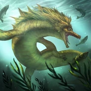 It is described as 10 meters (about 33 feet) long, with barracuda-like tusks, a horse-like but more slender neck, a mane around its neck, a gently sloping hill-like back, flattened limbs like those of a sea turtle, and a spiny, pointed tail.