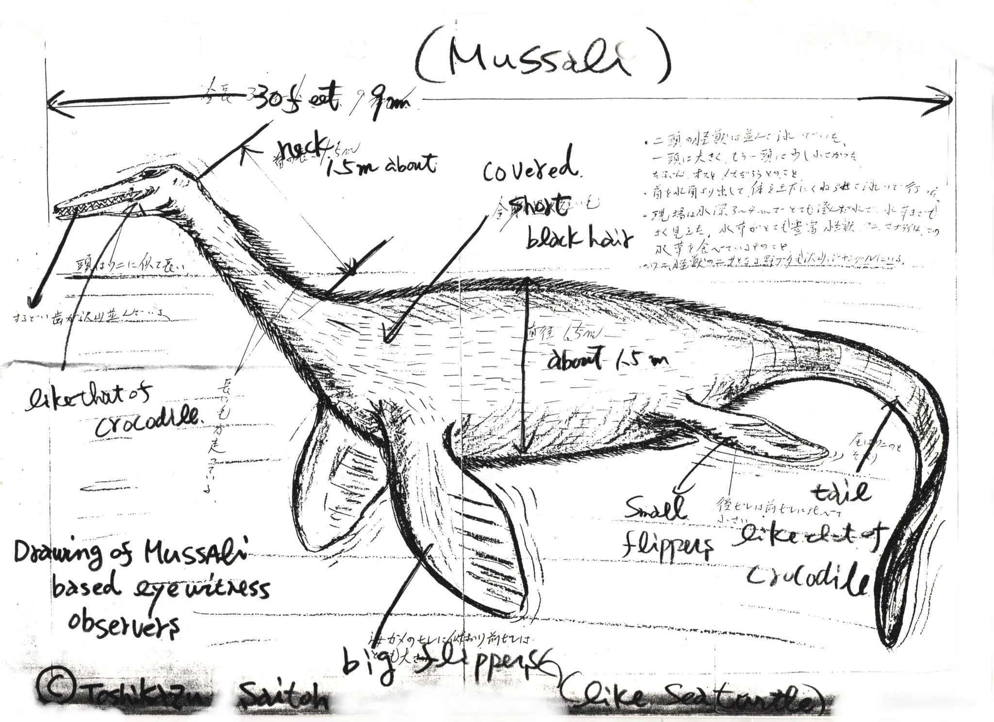 In 1978, Japanese cryptozoologist Toshikazu Saitoh stayed in the village of Bulumuri and interviewed five people who had seen the monster in the summer of 1971. Two monsters, one large and one small, were about 9 meters long, with a long, pointed head like a crocodile, a small head in relation to the body, numerous sharp teeth, a long neck, a stout, streamlined body, sea turtle-like limbs with significantly larger forelimbs, a thin tail similar to a crocodile, and long black body hair, especially at the neck. The creature appeared to swim at a depth of 3 to 4 meters. He was also told by the local people that the name of this creature is massali, masalai or mussali, that it eats water plants and wild pigs.