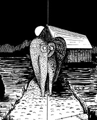 It was here in the TNT Area on the cold night of November 15th, 1966, three days after the first sighting took place, that two young couples would encounter this bizarre creature. Roger and Linda Scarberry were driving in Roger's black '57 Chevy Bel Air with Steve and Marry Mallette through the area around midnight when Linda noticed, unbelievably, two large, glowing red eyes in the darkness beside the old North Power Plant, and screamed. They soon learned that these eyes belonged to something that looked frankly human, about 7 feet tall with wings folded against its back. Roger stalled in the road for a minute, inspecting the strange creature. The four realized immediately that their spectacle was no ordinary bird. The true horror began, however, when the creature spread its wings and pursued them down Highway 62 to the Point Pleasant city limits at speeds exceeding 100 mph.