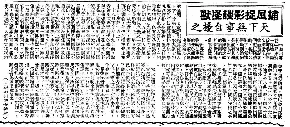 One night in late August, in Xinpi Township, an elderly woman witnessed a large, black, hairy creature fighting with a neighbor's puppy. The big black beast ran out of the village. The police formed a siege, but were not successful in capturing it.