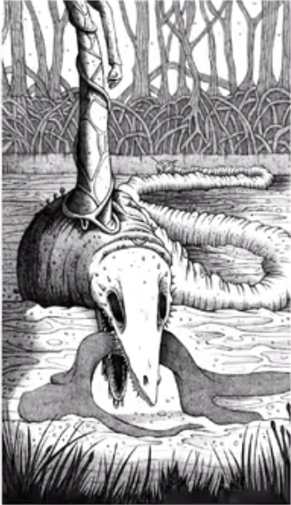 The Snoligoster (Dorsohastatus caudirotula) is a long amphibious creature from lumberjack folklore of North America, known as a fearsome critter. It dwells in swamps in the south, but it is especially common around Lake Okeechobee, Florida. The Snoligoster will eat any meat, but it prefers human flesh. When it catches someone, it will use its tail to toss the unfortunate victim onto the spike on its back (it will store the carcasses on its spike until it is hungry). Once it is ready to eat, it will drill a hole in the ground with its propeller tail, and scrape the bodies off of its spike into the hole. It will then proceed to grind the unlucky victims into a pulp, and then inhale and/or drink them. Sometimes the Snoligoster will just use its tail as a club to batter targets too evasive to stab.