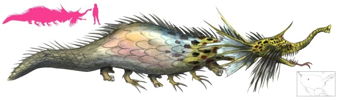 (the following information is from A Book Of Creatures.) – The Swan Valley Monster made its appearance on August 22, 1868, in the otherwise tranquil locale of Swan Valley, Idaho. Its presence was witnessed and reacted to by an unnamed old-timer crossing the river at Olds Ferry. The first thing he saw of the monster was an elephant’s trunk rising from below the surface and spouting water. This was followed by a snake-like head the size of a washtub, with a single horn that kept moving up and down, and long black whiskers on both sides of the face. It had ten-inch-long fangs and a red forked tongue that spewed green poison. When it hauled its massive body onto the shore, the old-timer noted that it must have been twenty feet long, and it stank to high heaven. A pair of wing-like fins – or fin-like wings – came out of the sides of its neck. Its forward half was like a snake, the thickness of a calf, greenish-yellow with red and black spots; this in turn led into a fish-like section with hand-sized rainbow scales shining in the sun; finally, the tail was a drab, scaly gray like a crocodile or lizard tail. Shiny black barbed spines, like those of a porcupine, lined its back from head to tail. Finally, it had twelve stubby legs that were easily missed at first glance; the first pair under the fins had hoofs, followed by two pairs of legs with razor-sharp claws, then a pair of hoofed feet, a pair of clawed feet, and another pair of hoofed feet near the tail. Of course, the old-timer’s first reaction to the abomination slithering up the bank was to fire a slug into its eye. The monster reared up, hissing, bellowing, and spurting poison over its surroundings, so it got shot a second time in its yellow belly, convulsed, and stopped moving. Everything its poison had touched, whether trees or grass or other living beings, withered and died. As the monster was too large to be carried off by one man, the old-timer returned to town to fetch a wagon and six strapping lads to help him, as well as a tarp to protect them from the poison. They could smell the odoriferous creature a hundred yards away, and one of the men had to stay with the horses to keep them from bolting, while another got sick and refused to come any closer. But when they reached the bank where the monster had fallen, there was nothing but withered vegetation and a trail leading to the water. Presumably the Swan Valley monster had crawled back into the river to die – or perhaps it didn’t die. Whatever its fate, the old-timer recommended keeping a close watch on the river, as “I’ve hunted an trapped an fished all over the state fer nigh ontuh seventy-five year… but I ain’t never seen nothin tuh compare with that speciment”.
