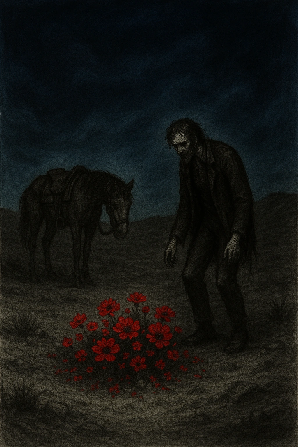 Some Mapuche-inspired interpretations suggest that the flower patch is the work of a wekufe—a malevolent spirit from indigenous belief systems. Wekufes are known to distort the natural order and feed off human suffering or death. In this version, the flowers are not truly plants, but manifestations of the spirit itself, luring travelers to their doom and consuming their newen (life energy). The spot where the flowers grow might be considered maldito, a cursed zone.