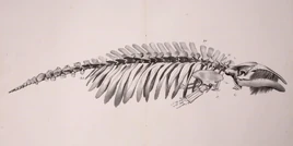 In March 1979, a local fisherman was fishing with a net when he found a huge bone in the net. It was a 10-meter long, articulated skeleton with a bit of ivory-colored flesh, a fin bone resembling a Japanese aralia leaf, and a skull the size of an oil drum at the end of its spine. The carcass was already rotting, and fishermen, thinking it would interfere with fishing, carried it 20 kilometers offshore and dumped it.